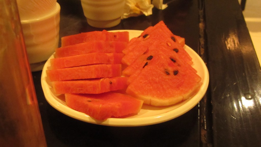 Breakfast consisted of a well presented watermelon slice, followed by 2 fried eggs and toast. Coffee was included, but tasted like the Beijing coffee 9that is, it tasted like hot chocolate). I will not complain though, its nicer to have black coffee by default rather than in Ireland where milk is always in it.