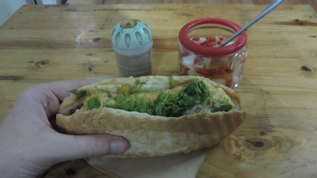 There were quite a few bánh mì stalls around house 5. Sometimes a woman would set up shop next to the front door at the mobile phone store. Others would be at more stable places like in the laneways, or in their house. Wherever they were. these were great meals to get you through the afternoon or to satisfy you for the evenings. A simple roll with a fried egg was my choice (bánh mì trung), but there were other options included pate, grilled meat (likely pork), vegetables or even a doner kebab variant. I would meet up with Sarah quite a bit to get bánh mì’s.