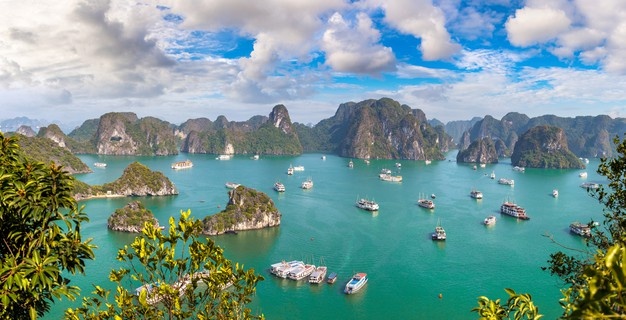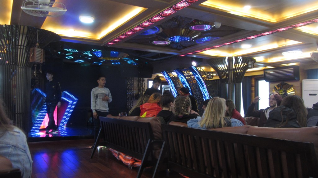We arrived at Ha Long just before noon. The harbour was misty and the city was in the distance. A wall of islands were further away than expected, and palm trees were outside the terminal. It seemed like the only notable thing in Ha Long was the ferris wheel, looking like a more tropical Silent Hill at times. The terminal was more welcoming, with welcoming staff, Leonie’s colourful Vietnamese flag, and the group in high spirits.