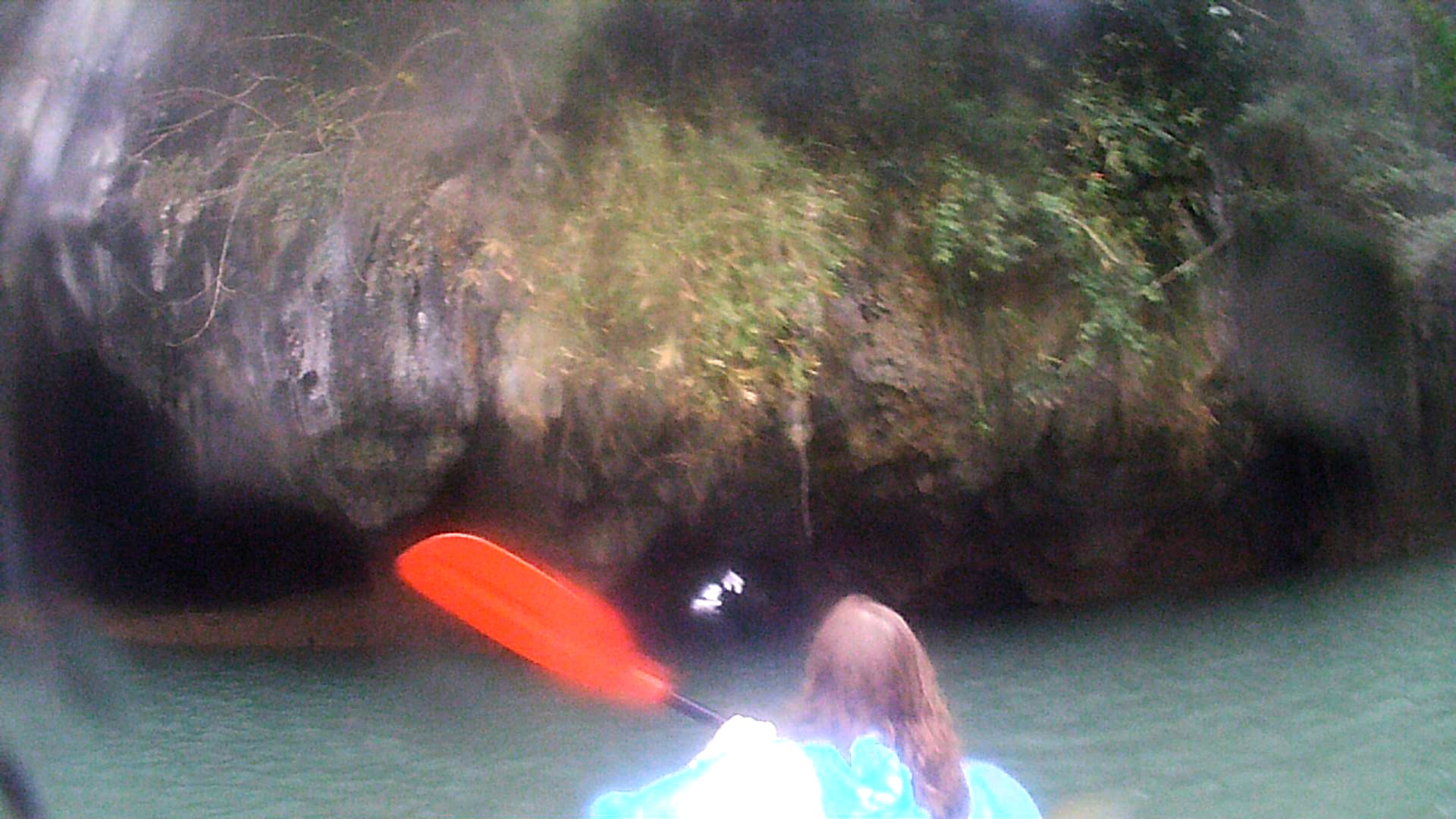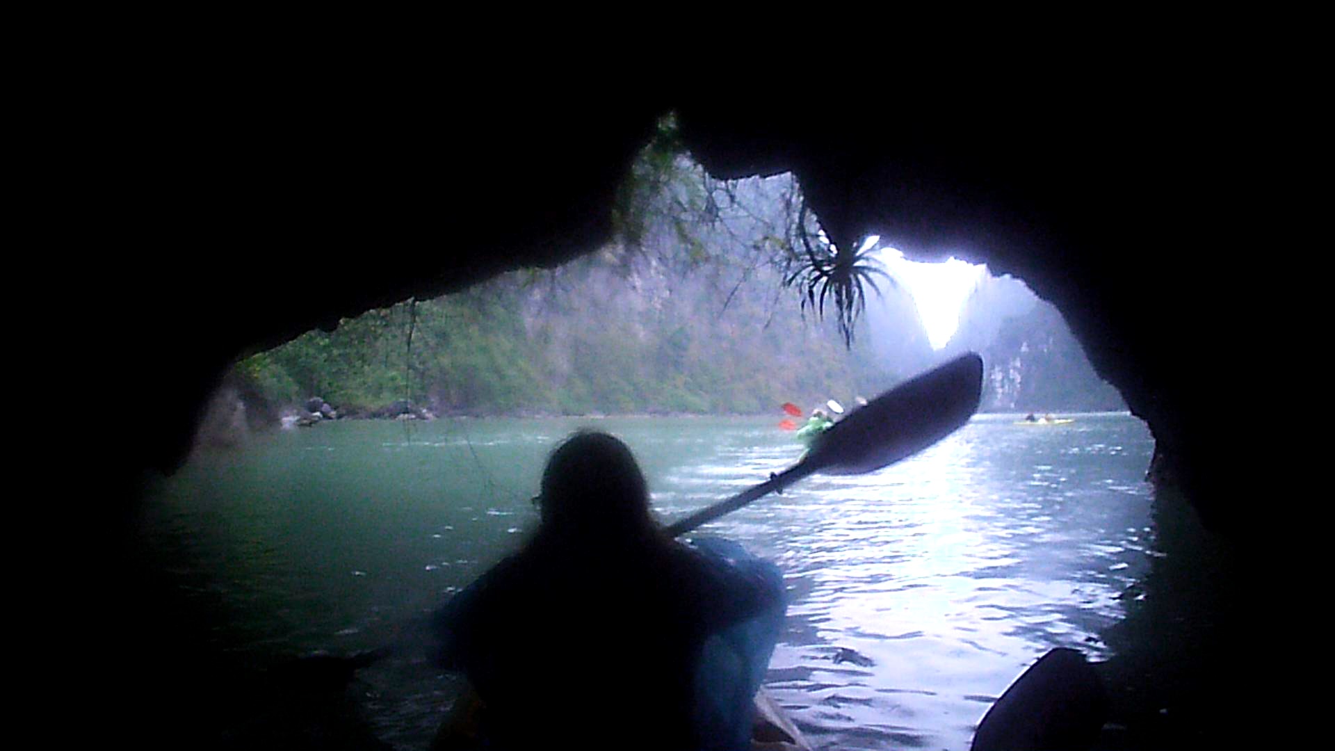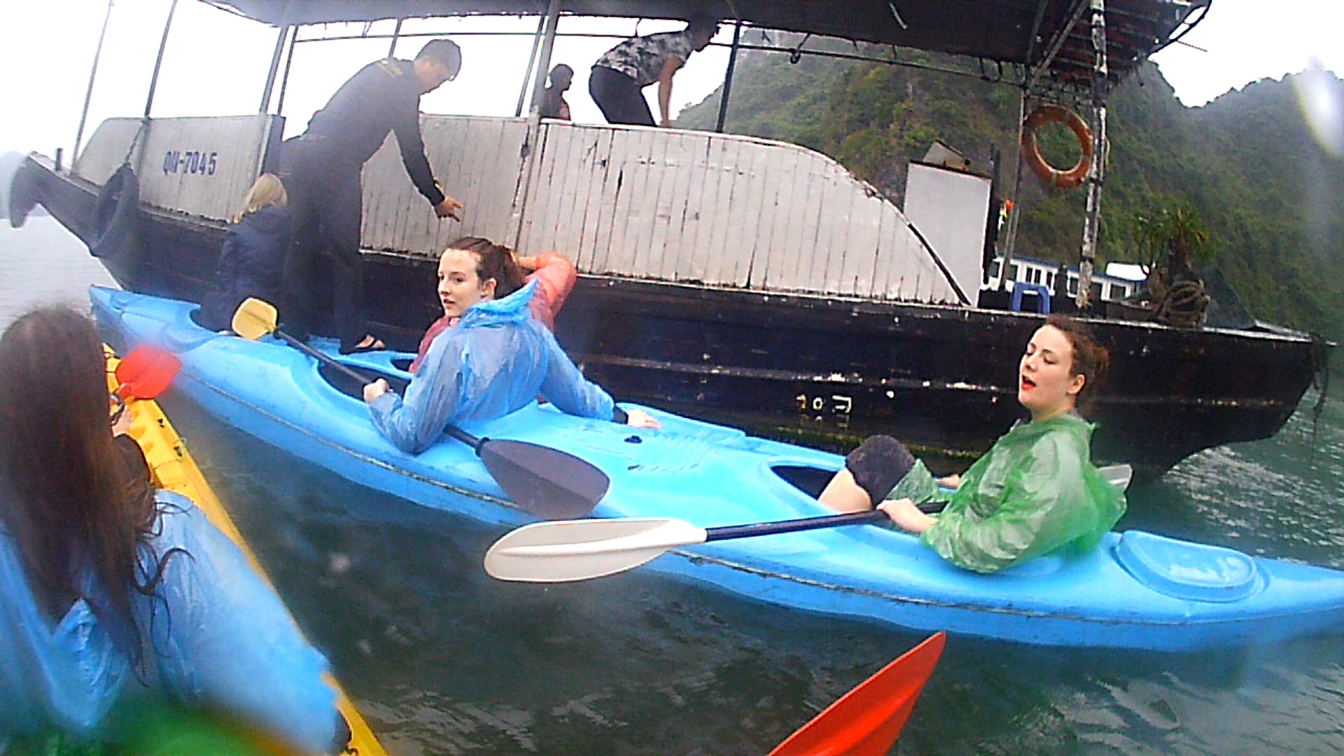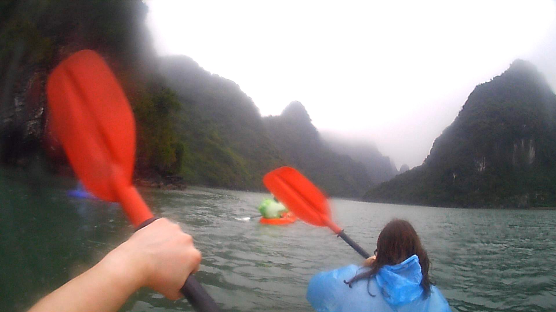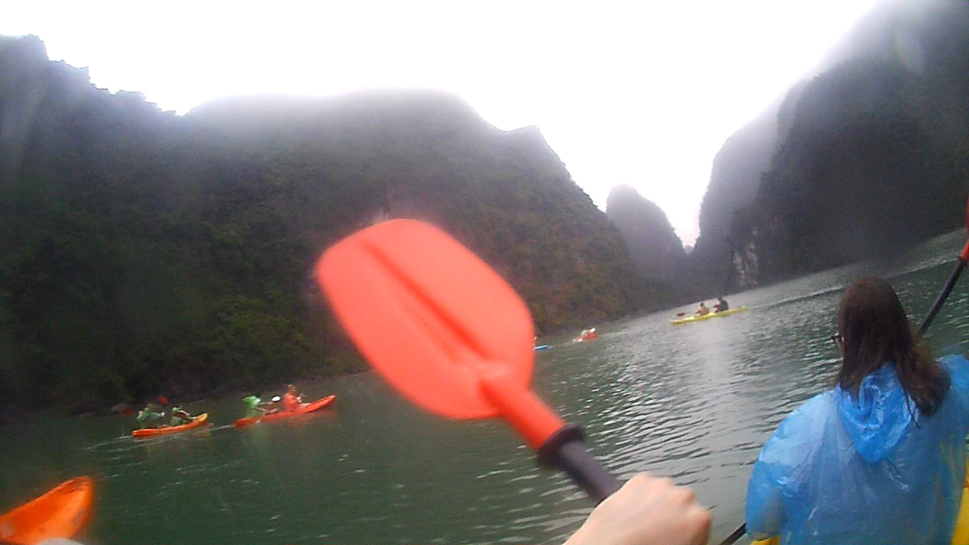 Afterwards we were set to go Kayaking. We put on some really thin ponchos, which felt more like putting on a Tesco plastic bag ,but it would keep the water at bay. I paired up with Rebecca and we kayaked along the bay. In truth she did a lot more rowing than me, all the stamina I have is in my legs and continually kayaking for more than 20 minutes at a time seemed to give me a need for a break. The other kayakers seemed faster, so we had to put more effort in keeping up. In any case we made it under limestone caves, through jagged pillars and finally into a lagoon in the bay, silent as it could possibly be, and with the occasional monkey howl heard and echoes through the misty area. It was surreal to hear such silence after all the noise in Hanoi. You would swear Kong was about to show up given the absolute silence before a massive attack on helicopters in the film.