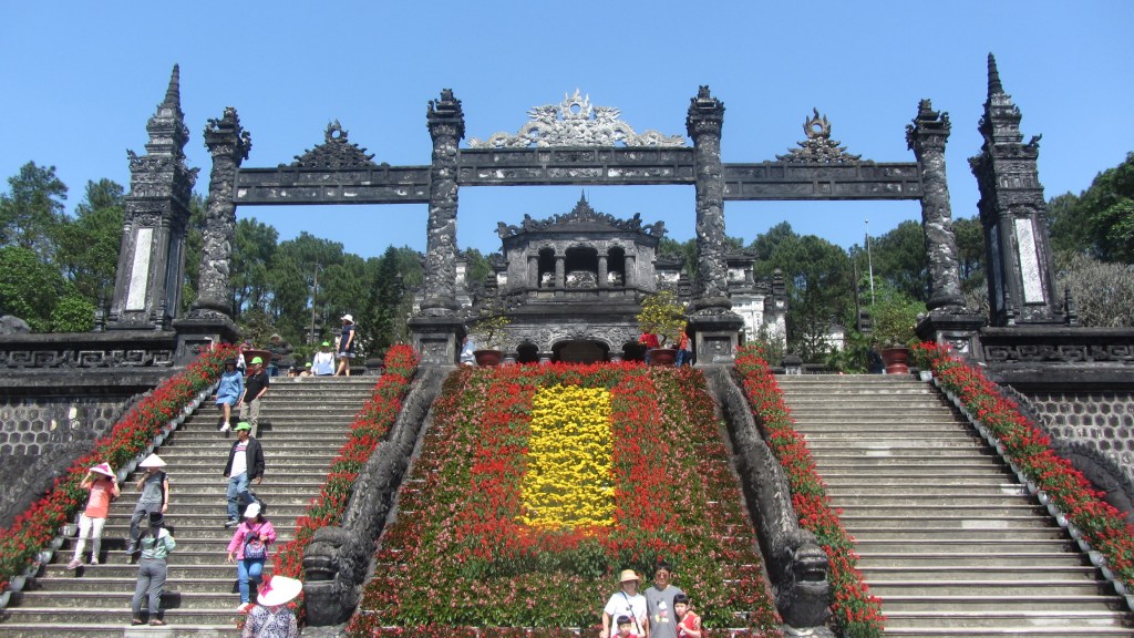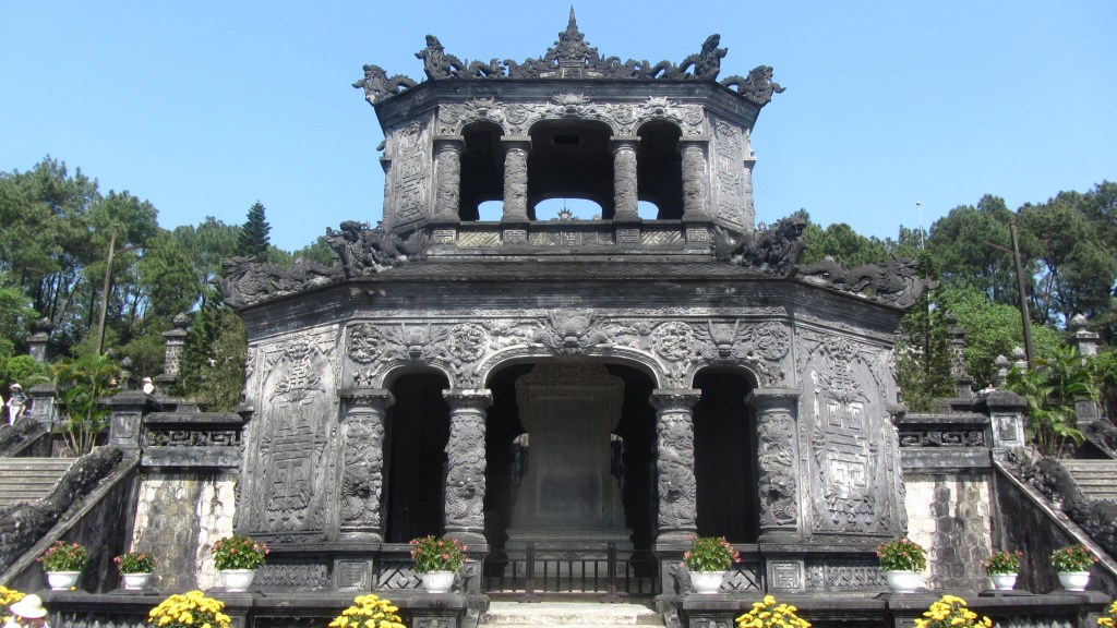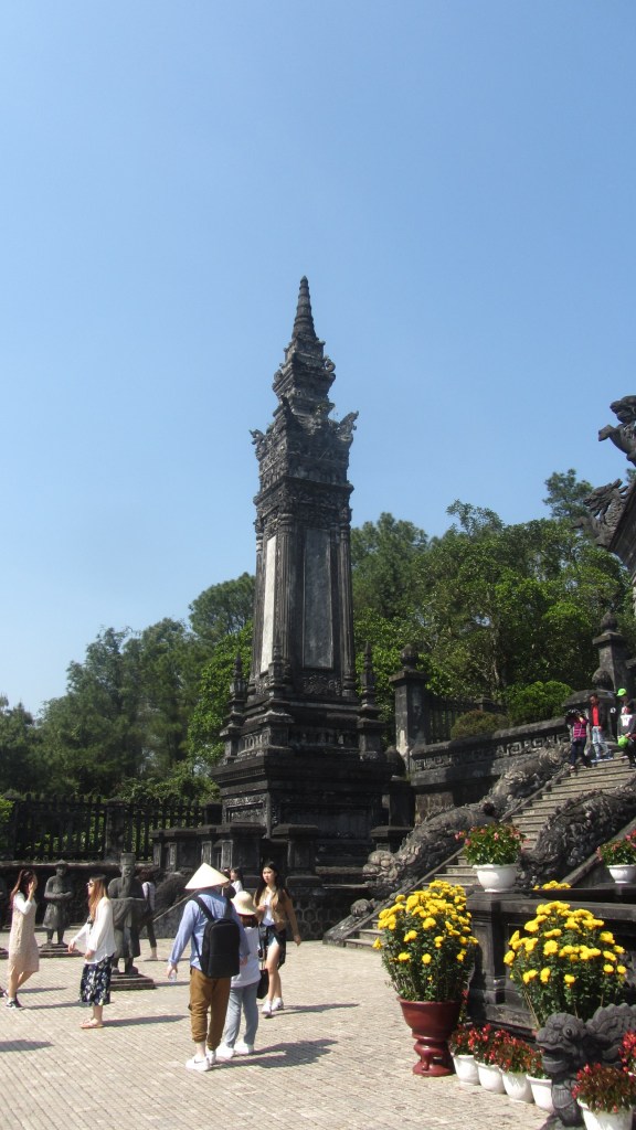 After a slightly longer drive, the bus stopped at the tomb of Khải Định. At first glance, it was large, imposing, rather monotone in its grey-scale look, and quite a hike to get to the top. It looked very impressive from the bottom, but as you climb the 127 steps you notice that something is up with the emperors tomb…